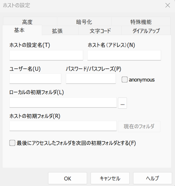 このままではFFFTPは何もすることができません。ということでサーバーにアクセスするために必要な情報を記入していきます。