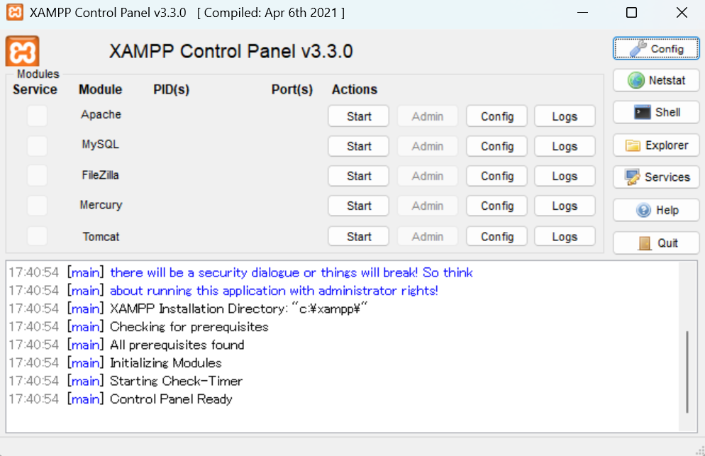 まずApacheを起動してください。Startというボタンを押すだけで起動できます。
